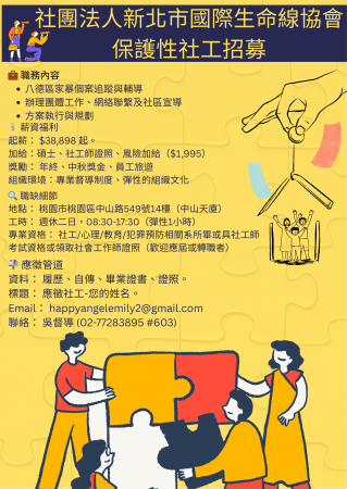 【徵人】以家庭為中心之整合性服務方案+誠徵保護性社工員(師)